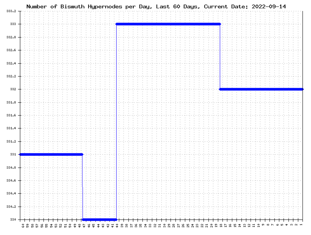 The plot below shows all Hypernodes, both active and inactive, during the last 60 days. As can be seen from the plot, the number of Hypernodes is currently at 332, down by 1 node since the last report.