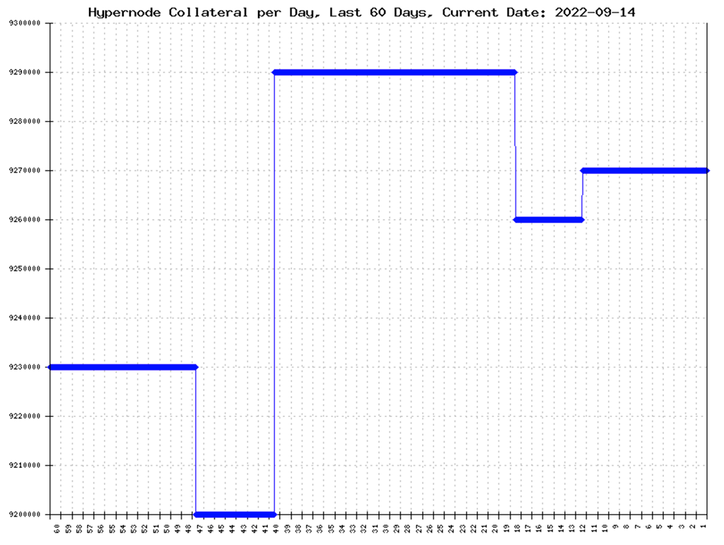 The plot below shows the total Hypernode collateral, both active and inactive, during the last 60 days. As can be seen, the total amount of collateral is 9,270,000 during this period. The total amount of BIS in circulation is 32,85 million. Hence, the amount of active collateral accounts for 16.3 % of the total supply, or 28.2 % if the amount of inactive collateral is included.