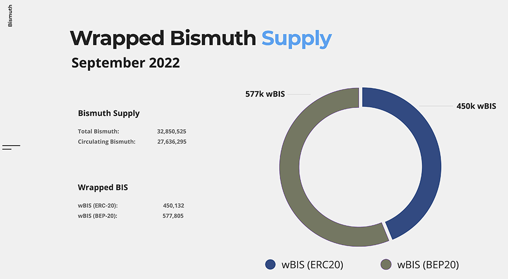 An overview of the Wrapped BIS supply on the Ethereum blockchain (ERC20) and a summary of Wrapped BIS supply on the Binance Smartchain.